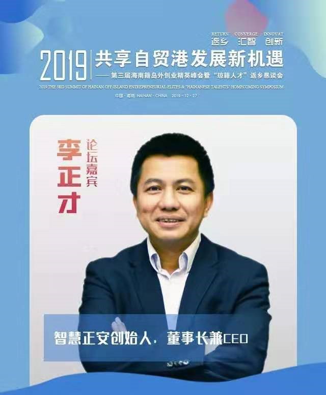 2019年12月27日,第三屆海南籍島外創(chuàng )業(yè)精英峰會(huì )暨“瓊籍人才”返鄉懇談會(huì )在??谂e行。來(lái)自美國、英國、瑞典、日本、馬來(lái)西亞等國家的瓊籍華僑華人創(chuàng )新創(chuàng )業(yè)代表,以及北京、上海、廣州、深圳、杭州、成都等地瓊籍行業(yè)領(lǐng)軍人物、創(chuàng )業(yè)精英共計500余人匯聚???,分享創(chuàng )業(yè)經(jīng)驗、共商返鄉大計,推動(dòng)瓊籍全球創(chuàng )新創(chuàng )業(yè)人才團結合作,為海南自貿區、自貿港建設建言獻策,貢獻力量。智慧正安創(chuàng )始人、董事長(cháng)兼CEO李正才受邀參加本次圓桌會(huì )議。